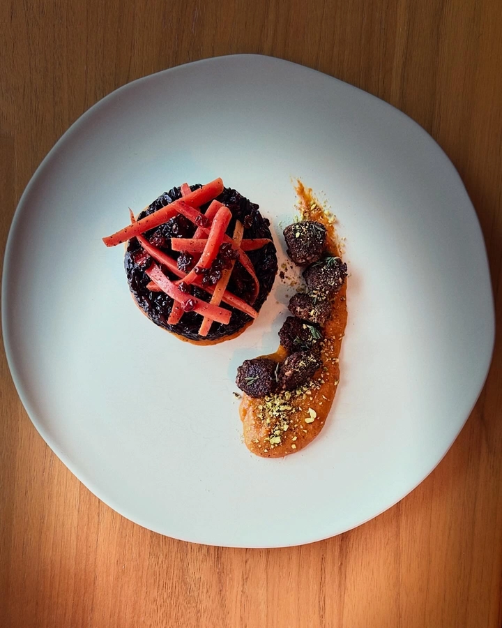 Plate the cooked forbidden rice, top with the tomato sauce, sautéd carrots, vegan meatballs, and fried barberries. Garnish with additional thyme or sumac if desired.