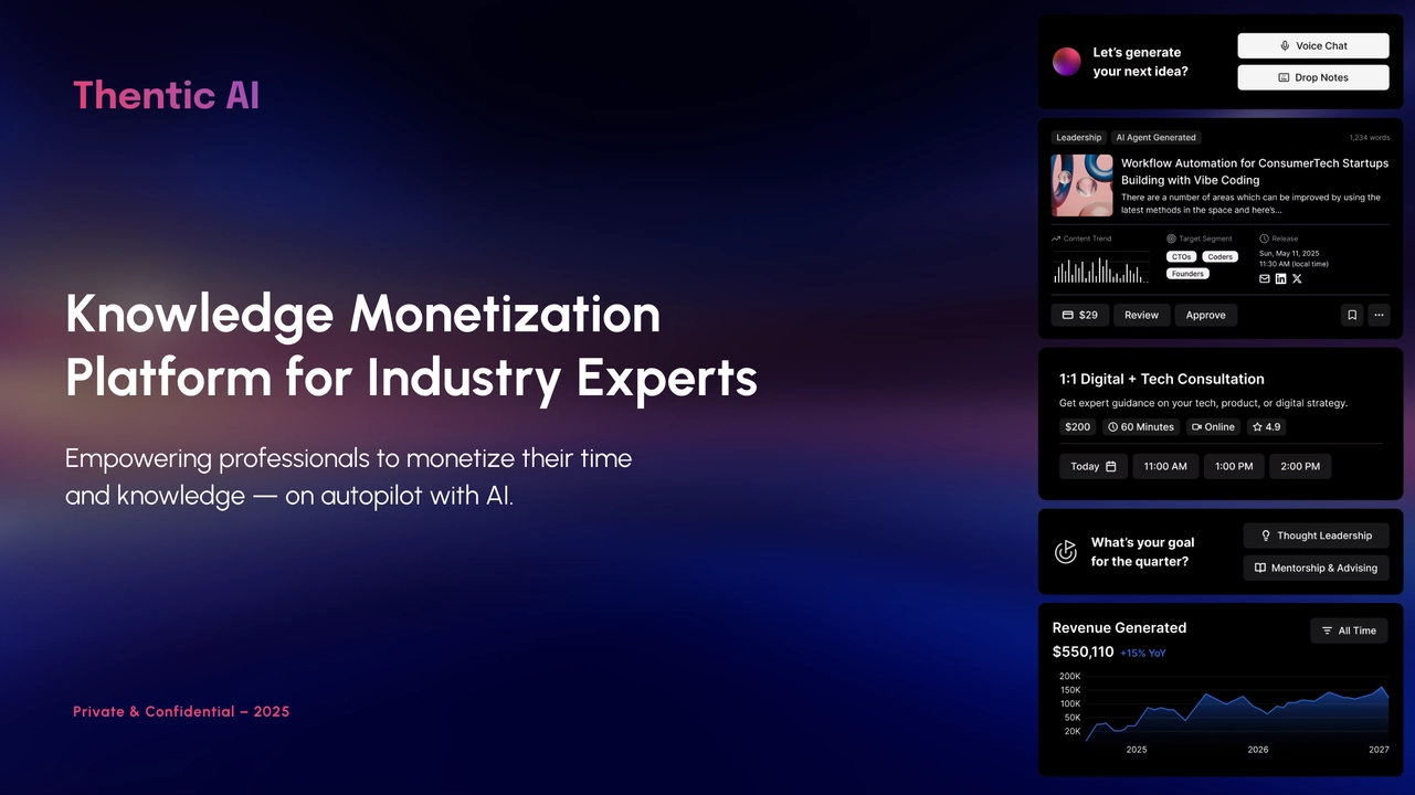 Much of the world’s most valuable knowledge lives in the minds of experienced professionals, yet it remains underutilized—trapped in closed networks or siloed within organizations. Thentic AI unlocks this potential by offering an AI-native platform that helps experts instantly create a digital presence, share their insights, and monetize their expertise through consulting, content, or curated offerings.
